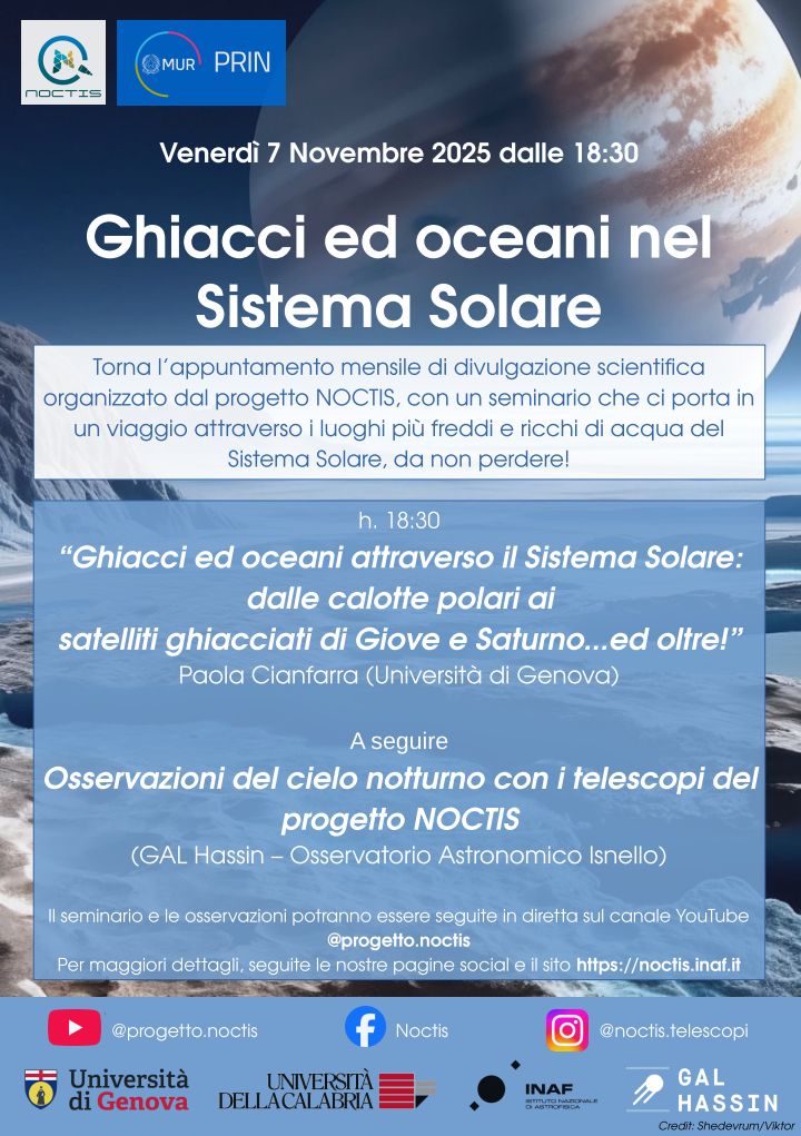 Paola Cianfarra dell’Università degli Studi di Genova e Alessandro Nastasi della Fondazione GAL Hassin – Centro Internazionale per le Scienze Astronomiche di Isnello (PA) all’interno del Programma NOCTIS presentano l’evento Evento “Ghiacci ed oceani nel Sistema Solare. Dalle calotte polari ai satelliti ghiacciati di Giove e Saturno e oltre”.